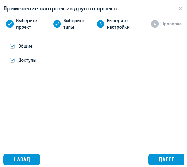 В окне обновления, выберите проект и необходимые параметры которые нужно перенести.